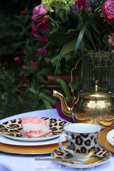 The riser bought at a local gift shop elevated the teapot, and the gold trim matched the gold accents on the teapot and cups and saucers.
